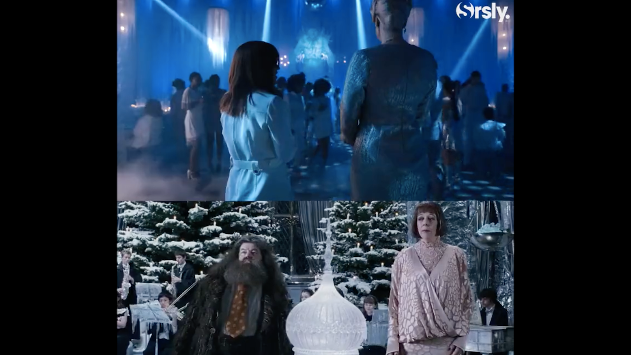 Robbie Coltrane y Frances de la Tour, quienes dan vida a Hagrid y Olympe Maxime, asisten al baile. La diferencia de alturas también se observa en Merlina, con Christina Ricci y Gwendoline Christie en el baile de Nevermore.