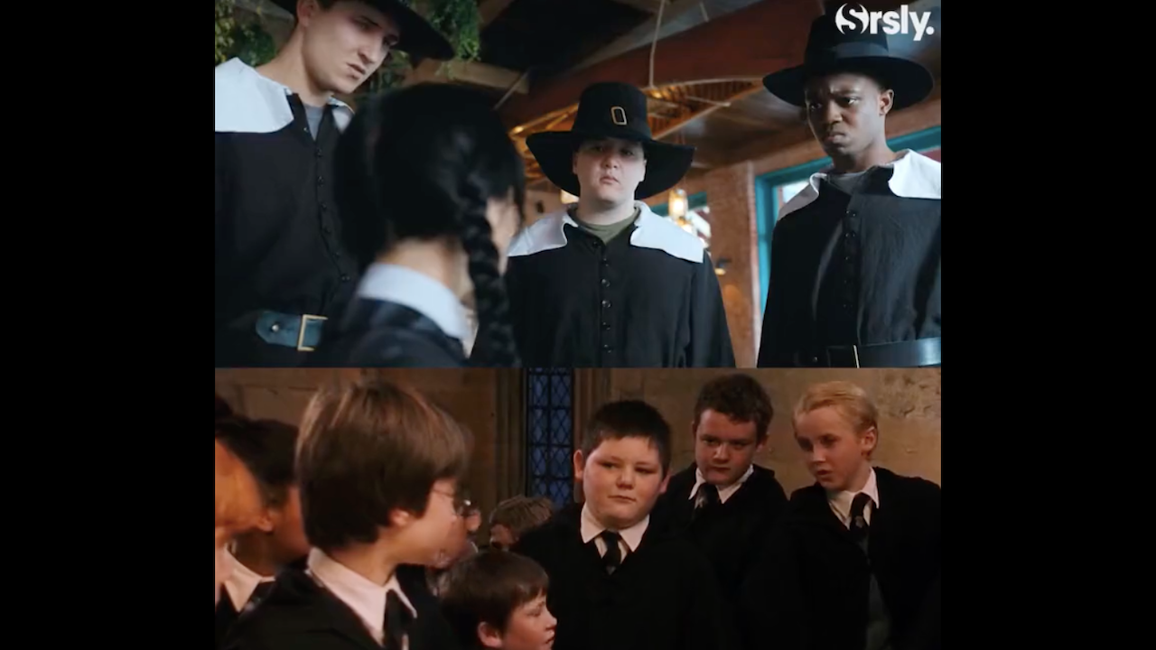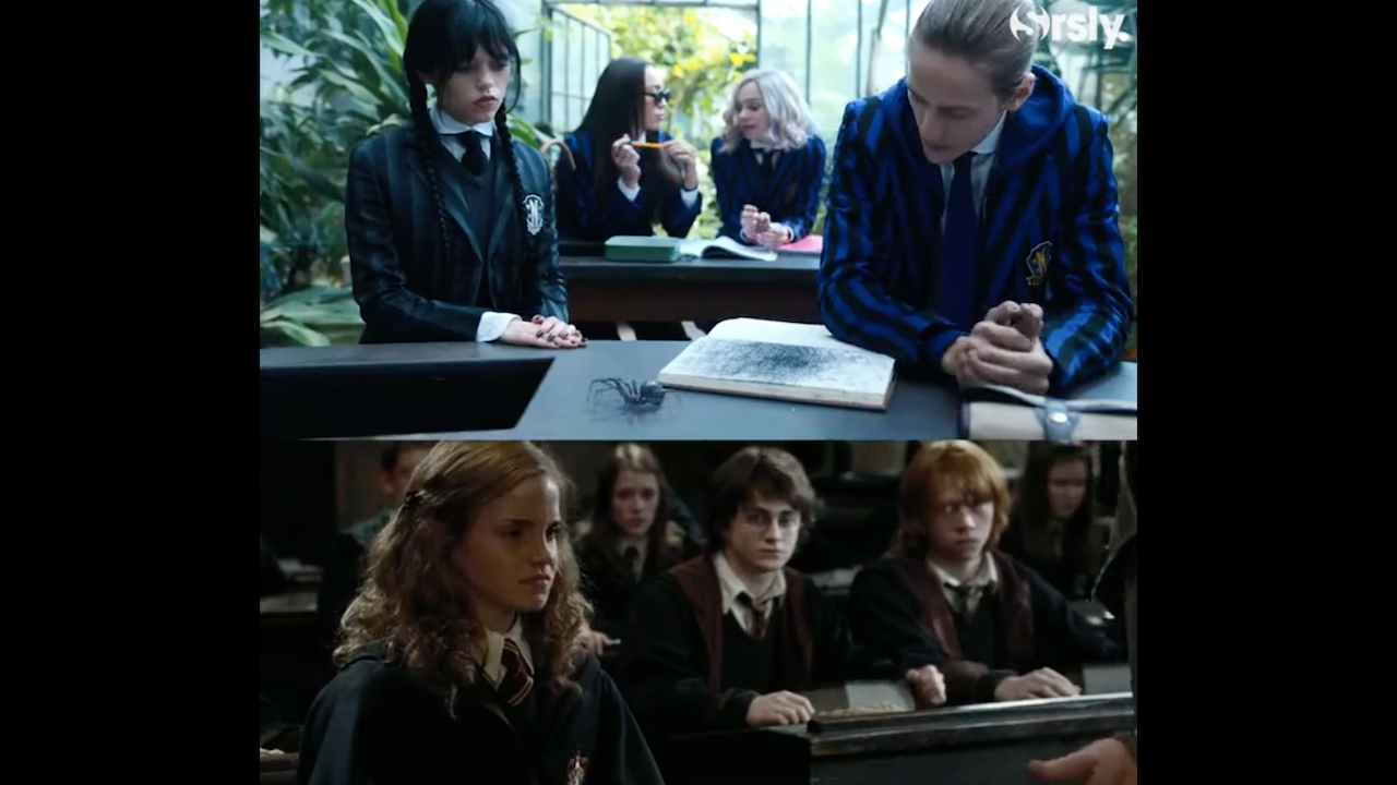 Una escena muy parecida de Harry Potter y el cáliz de fuego aparece en la nueva versión de Los locos Addams donde Hermione fue testigo del poder de las tres maldiciones imperdonables.