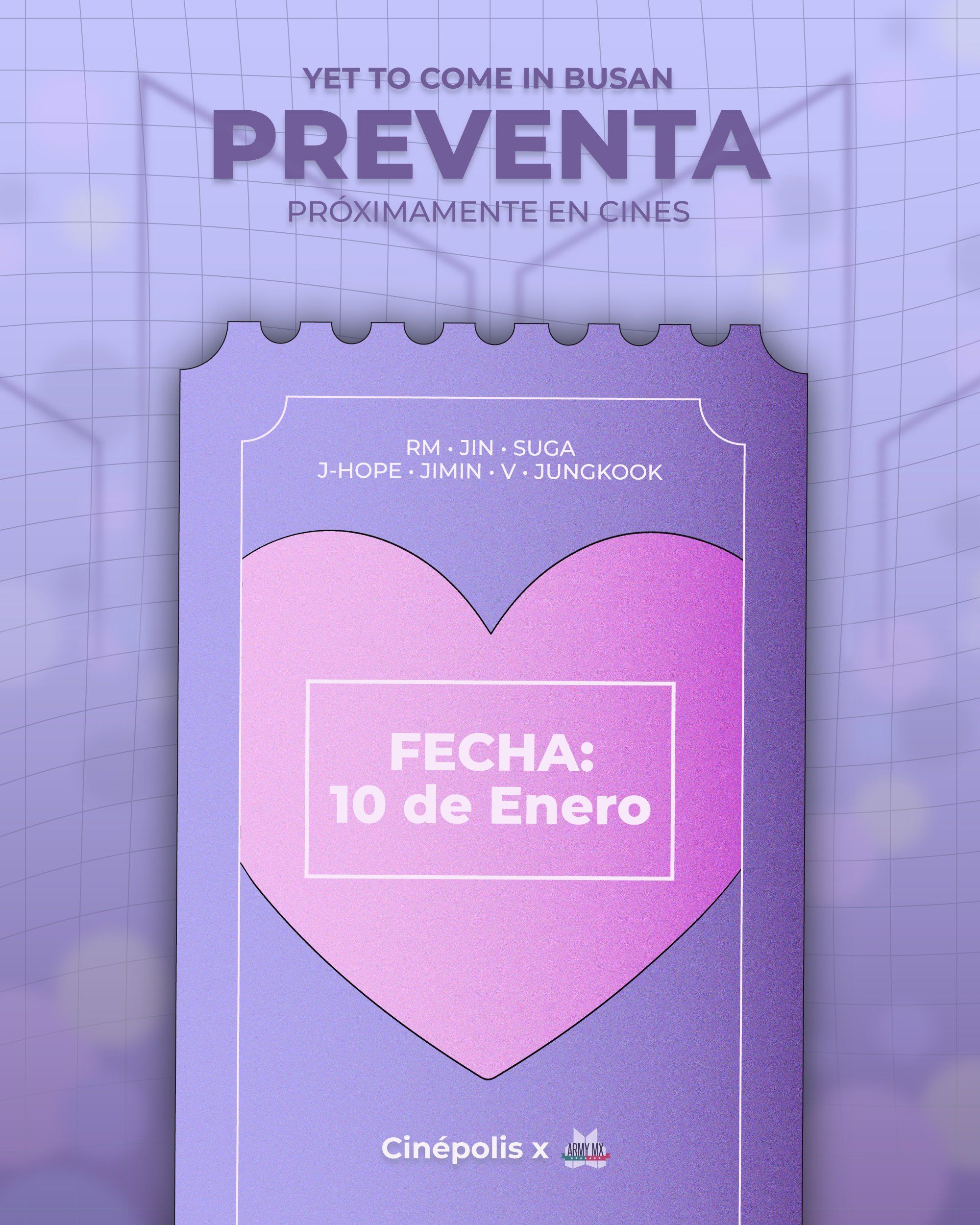Por supuesto la publicación fue acompañada de una imagen donde -por fin- se confirmó que la preventa para BTS Yet to Come in Cinemas estará disponible en Cinépolis a partir del próximo 10 de enero, fecha en la que podrás disfrutar de una de las últimas presentaciones de Jin, RM, J-Hope, Jimin, V, Suga y Jungkook juntos como agrupación.