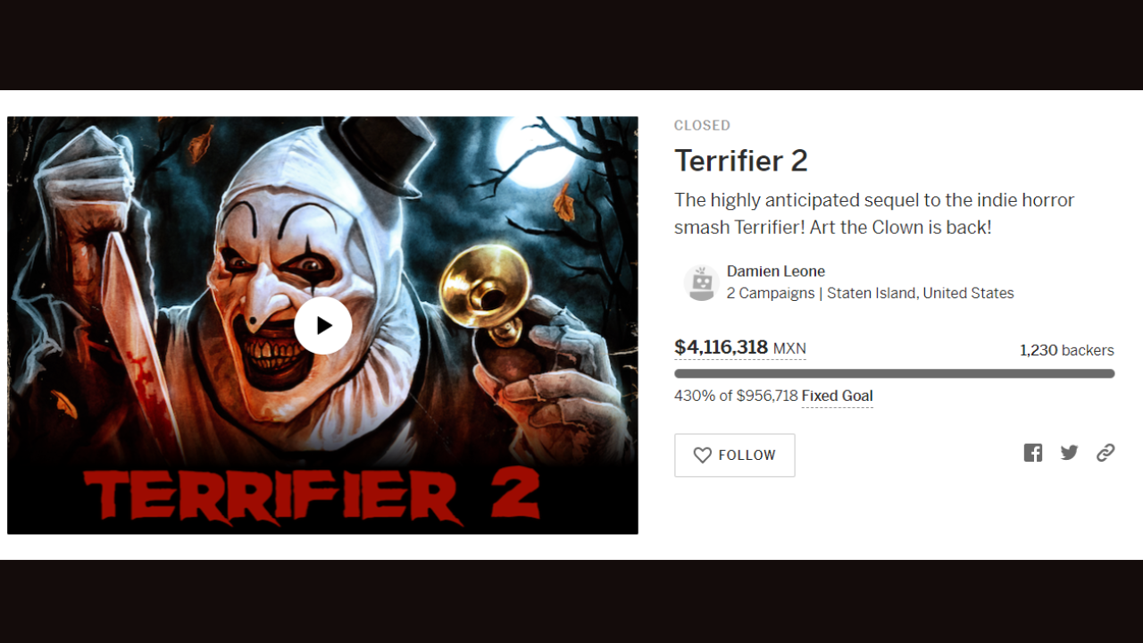 Después de la película de 2016, Leone decide financiar colectivamente la secuela a través de Indiegogo, con la promesa de resucitar al icónico Art The Clown para otra ronda de asesinatos y caos. Y por lealtad a sus inversores, Leone cumple con creces el producto final.