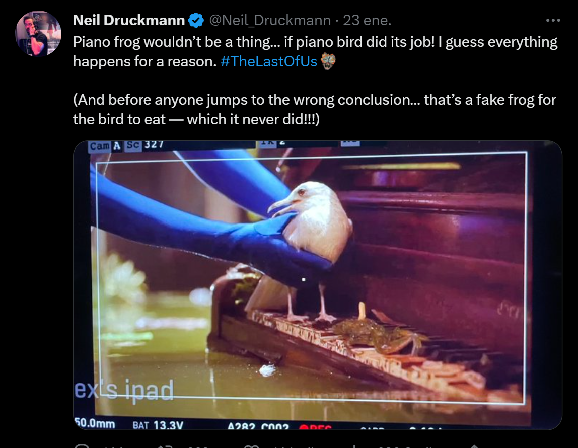 Mediante una publicación en Twitter, Neil Druckmann, hizo una de las grandes revelaciones del capítulo 2 de The Last of Us y no tuvo nada que ver con el contagio de Cordyceps o el violento comportamiento de los Clickers (contagiados con cabeza repleta de hongos). Se trató de una imagen detrás de cámaras donde confirmó que la escena de la rana en el piano no salió como estaba planeada y decidieron dejar el error en el corte final.