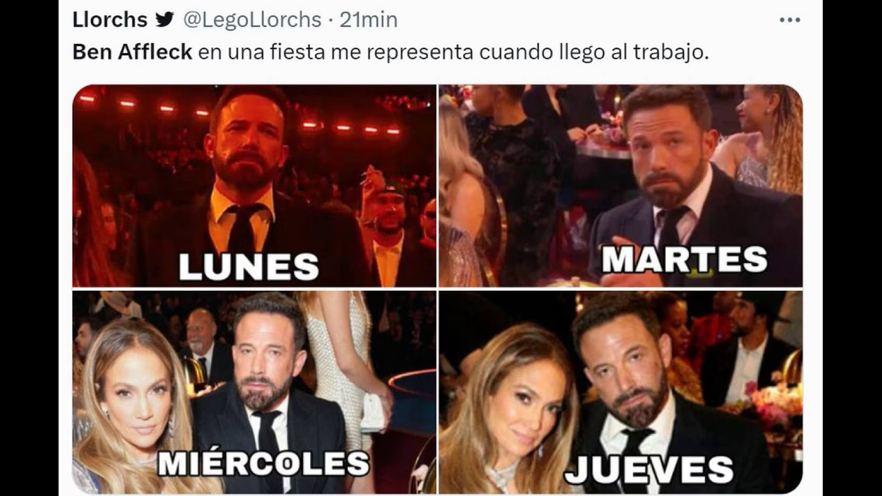 Por supuesto, los internautas no dejaron pasar esta increíble oportunidad para eso que mejor saben hacer: memes. "Por muy mal día que estés teniendo, recuerda a Ben Affleck en los Grammy en este momento", "Ben Affleck es yo cuando voy a una fiesta y pienso que mejor me hubiera quedado en mi casa" y "Cuando te das cuenta de que volver con tu ex no fue buena idea", fueron algunos de los comentarios de los usuarios en redes sociales.
