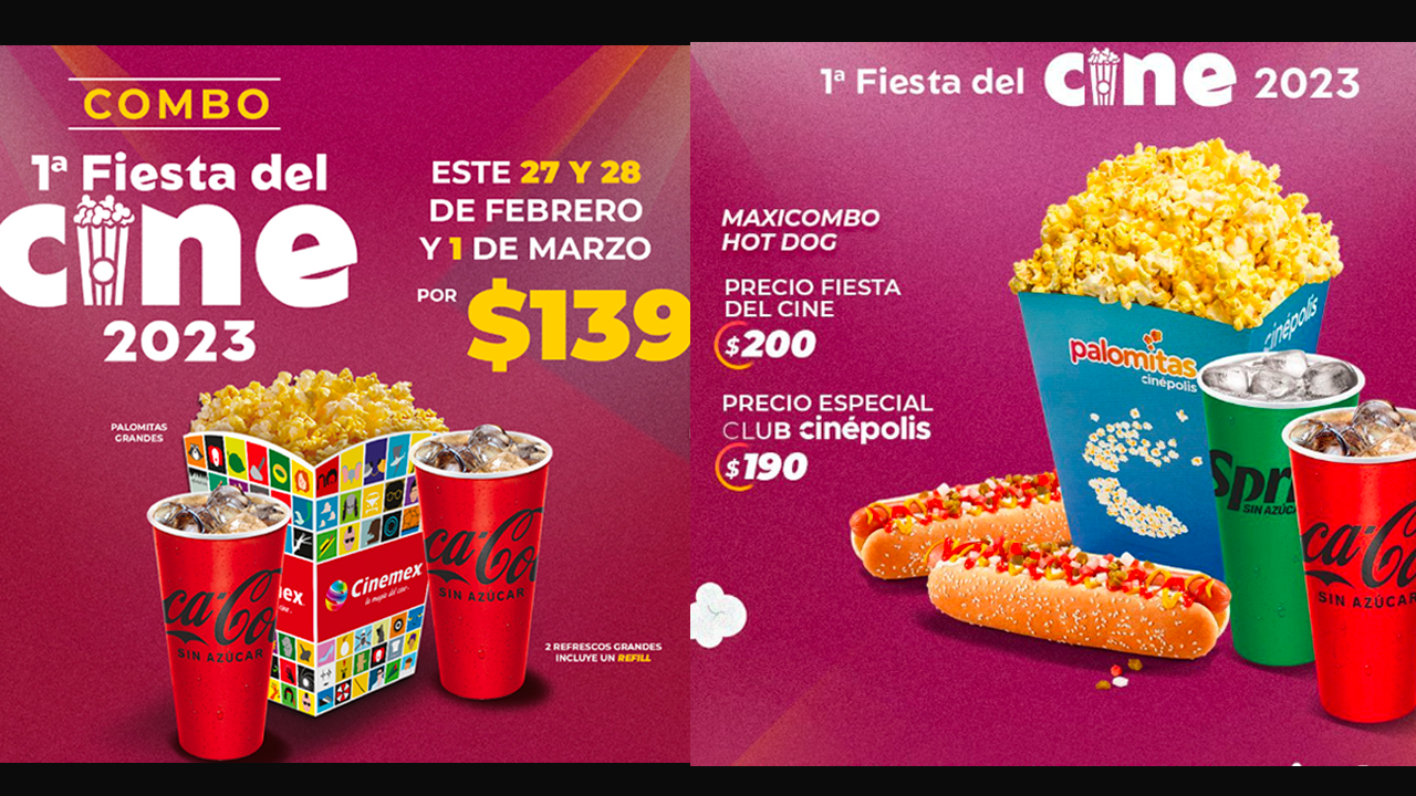 Por su parte Cinemex anunció que el combo básico de palomitas y refresco grande tendrá un costo especial de $89 pesos mexicanos, mientras que en salas Platino este aumentará a $99 pesos. Si vas acompañado, entonces puedes contemplar que las palomitas y dos refrescos grandes costarán $139 pesos y en salas platino $149 pesos mexicanos. Recuerda que las bebidas tendrán opción de refil. En ambas cadenas de cine estas promociones solo serán válidas durante la fiesta del cine, es decir 28 y 29 de febrero y primero de marzo.