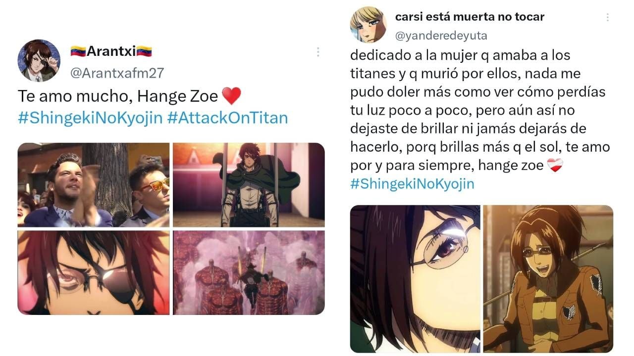 También aprovecharon para hacer un recuento de todos sus hallazgos y su increíble personalidad "Abro hilo en honor a la muerte en el anime de Hange Zoe, la decimocuarta comandante de la legión de reconocimiento. A mi niña que entregó su corazón creyendo que era lo mínimo que podía", escribió @dynafitf; mientras que otros no podían ni poner en palabras lo que sintieron tras ver el episodio.