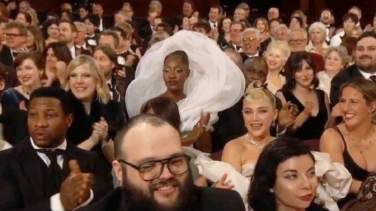 Su atuendo era voluminoso y fue uno de los más llamativos sobre la alfombra champagne (si no sabes por qué cambió de color, acá te contamos), pero una vez dentro del Dolby Theatre la historia cambió por completo, pues cuando se sentó no dejó ver nada a los espectadores que se encontraban detrás de ella. Tems estaba sentada justo atrás de Florence Pugh y Jonathan Majors, así que se salvaron por poquito de que les arruinaran la experiencia.