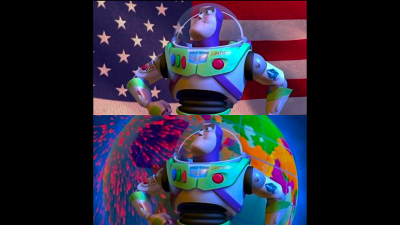 A menos que hayas visto la versión Estados Unidos, te darás cuenta de que Toy Story 2 hizo dos versiones de la misma escena. Cuando Buzz da unas palabras de aliento en la versión de Estados Unidos se muestra la bandera de ese país, mientras que en la versión internacional aparece un globo terráqueo.