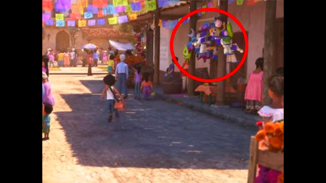 Con las voces de Gael García, Angélica Rivera y Marco Antonio Solís, Coco hizo historia al presentar una de las tradiciones más populares de México. Mientras Miguel se dirige a su casa pueden verse un par de piñatas con las figuras de Mike Wazowski y los juguetes insignia de Toy Story.