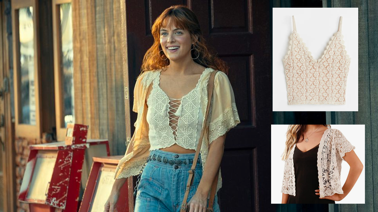 En uno de los episodios, hay un momento muy significativo para Daisy (Riley Keough), quien hace su primera presentación en un bar casi vacío. En ella utiliza un top corto con tirantes blanco el cual puedes encontrar fácilmente en cualquier tienda departamental. En H&M podrás encontrar varios parecidos tipo crochet en 400 pesos mexicanos. La camisa de encaje podrás adquirirla en Amazon por $359. Mientras que los jeans tiro alto pueden ir desde los $500 hasta los $800.