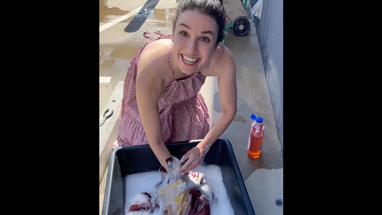 Uno de los requisitos para ser una gran superheroína es la higiene. Grace puso a remojar su traje para limpiarlo y poderlo usar durante las grabaciones.