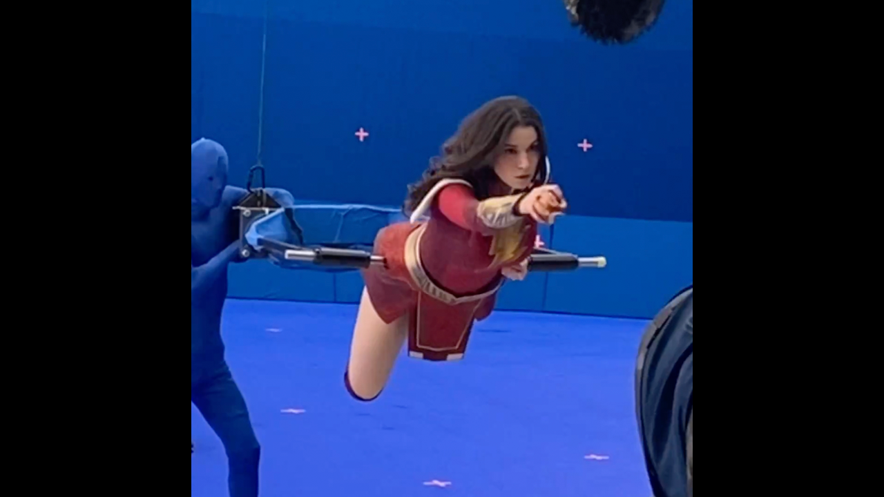 Ser una superheroína no es cosa sencilla y las imágenes son la prueba. Aquí aparece Grace colgada de un par de cables mientras espera con mucho humor a que se grabe la siguiente escena.