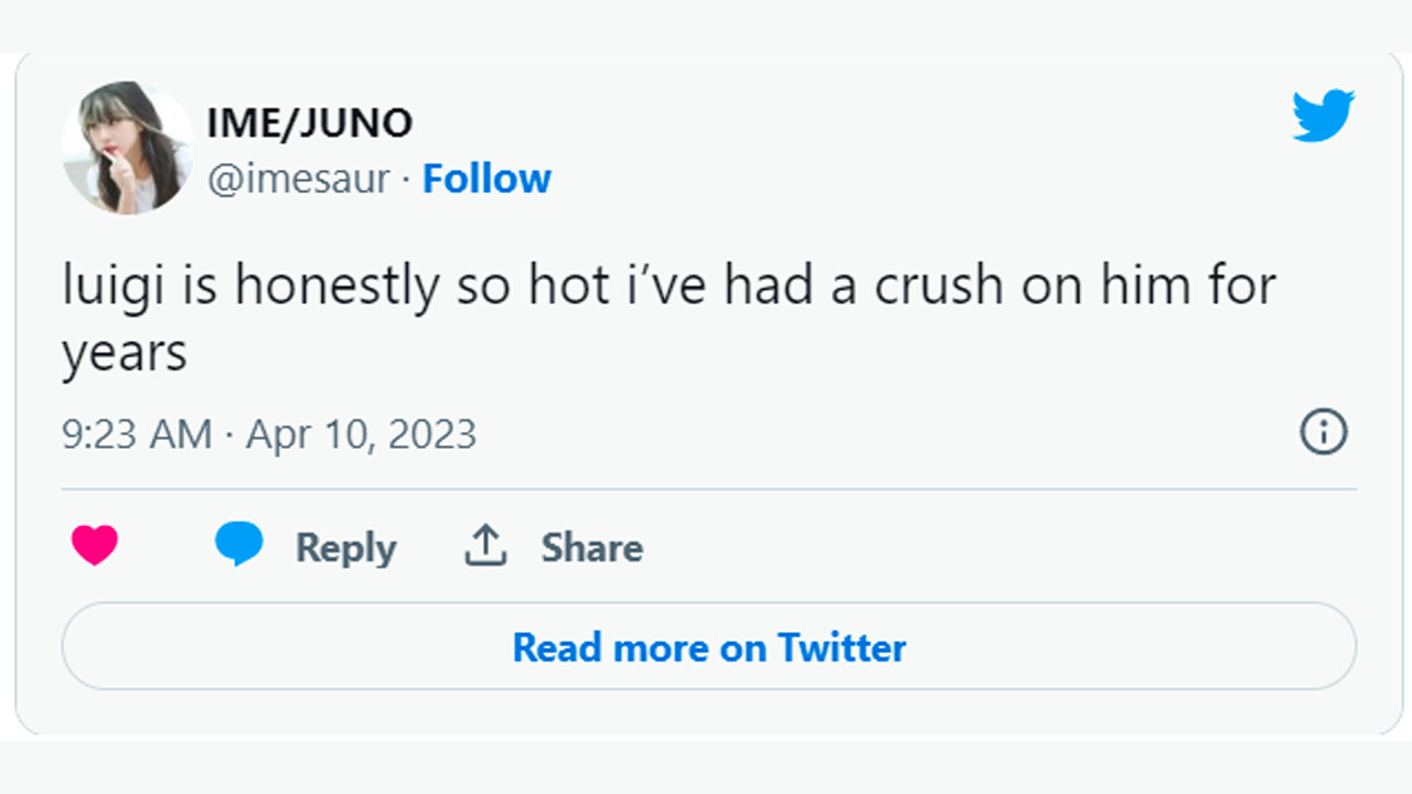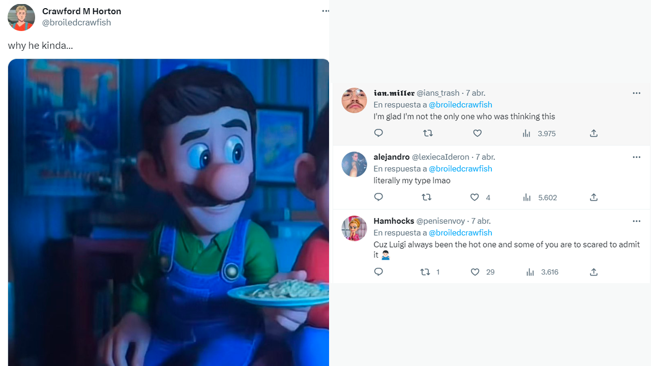 En algunos tuits se pueden leer comentarios como: "Luigi está muy hot ahora", "No soy gay, pero Luigi es bastante atractivo", "Bowser en la película de Mario está hot y Luigi también", "Mi mamá viendo la película de Mario: '¿Es raro que crea que Luigi está bueno? Me gusta su cabello'", "Honestamente, Luigi está tan bueno que he estado enamorada de él durante años", "Vi la película de Mario y spoiler, Luigi es muy sexy y Bowser también.. wtf".
