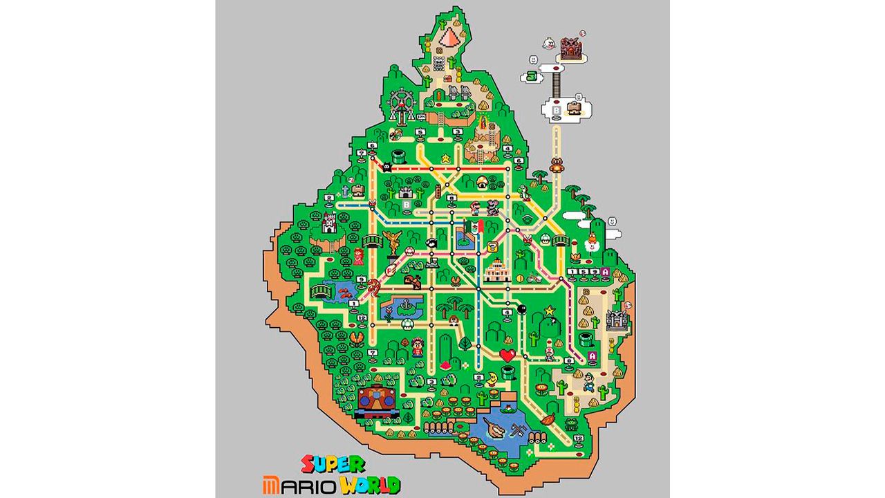Y para mantener el estilo de la ilustración, también se puede ver cómo la tipografía fue adaptada para armar el nombre Super Mario World, esto con la “M” del metro en medio de las coloridas letras que nos hacen recordar distintas entregas como Mario + Rabbids Kingdom Battle o Super Mario Galaxy.
