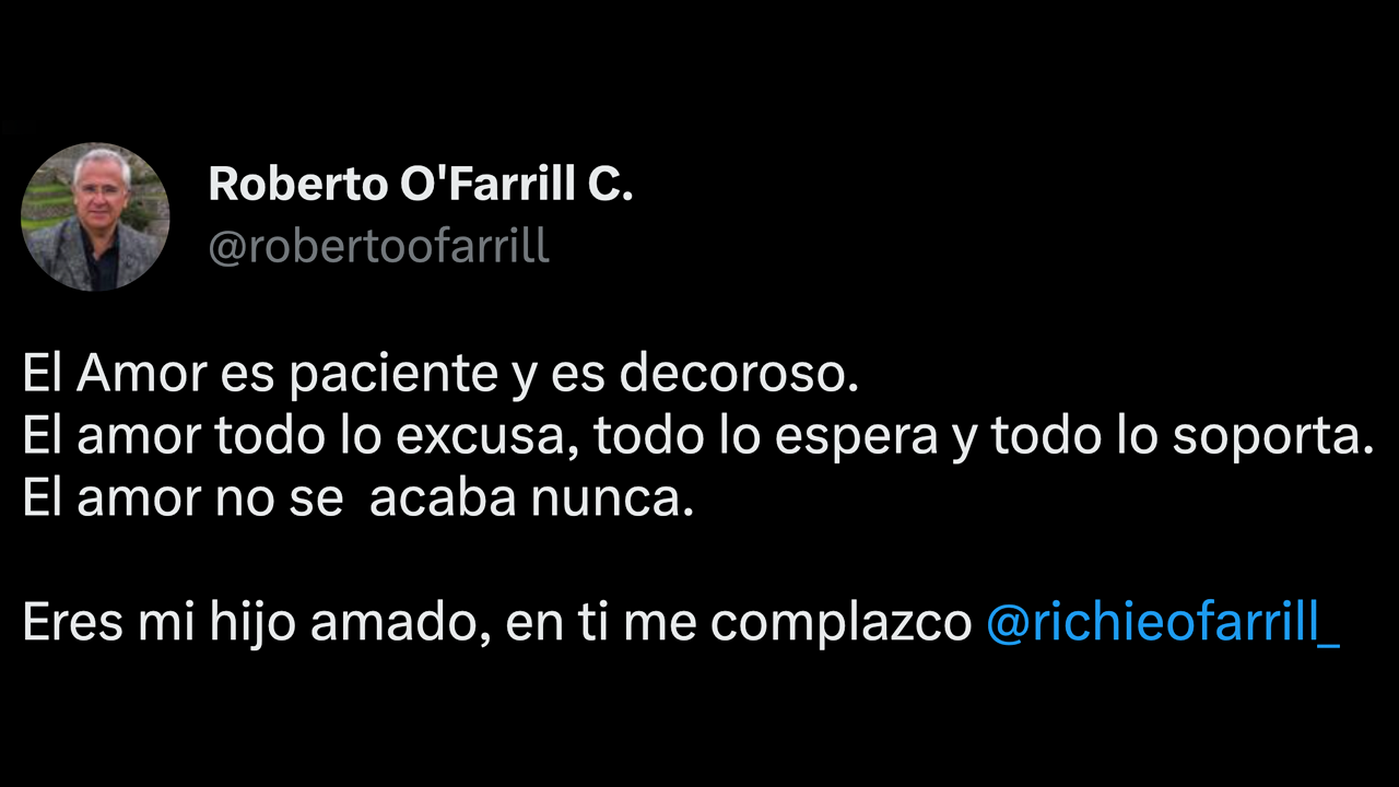 En otra publicación, el padre del standupero compartió un mensaje religioso que habla sobre el poder del amor acompañado de una imagen con su hijo: "El amor es paciente y es decoroso. El amor todo lo excusa, todo lo espera y todo lo soporta. El amor no se acaba nunca". Finalmente, Roberto concluyó sus palabras recordando al comediante que es su hijo amado y que se complace de ello.