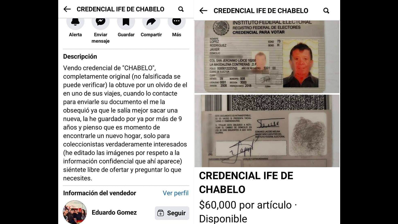 A través de Marketplace, un usuario de Facebook identificado como Eduardo Gómez puso a la venta la supuesta identificación oficial del "amigo de todos los niños". "Vendo credencial de "CHABELO", completamente original (no falsificada se puede verificar)", dice la publicación que asegura que se trata de un documento completamente auténtico que perteneció a Xavier López.