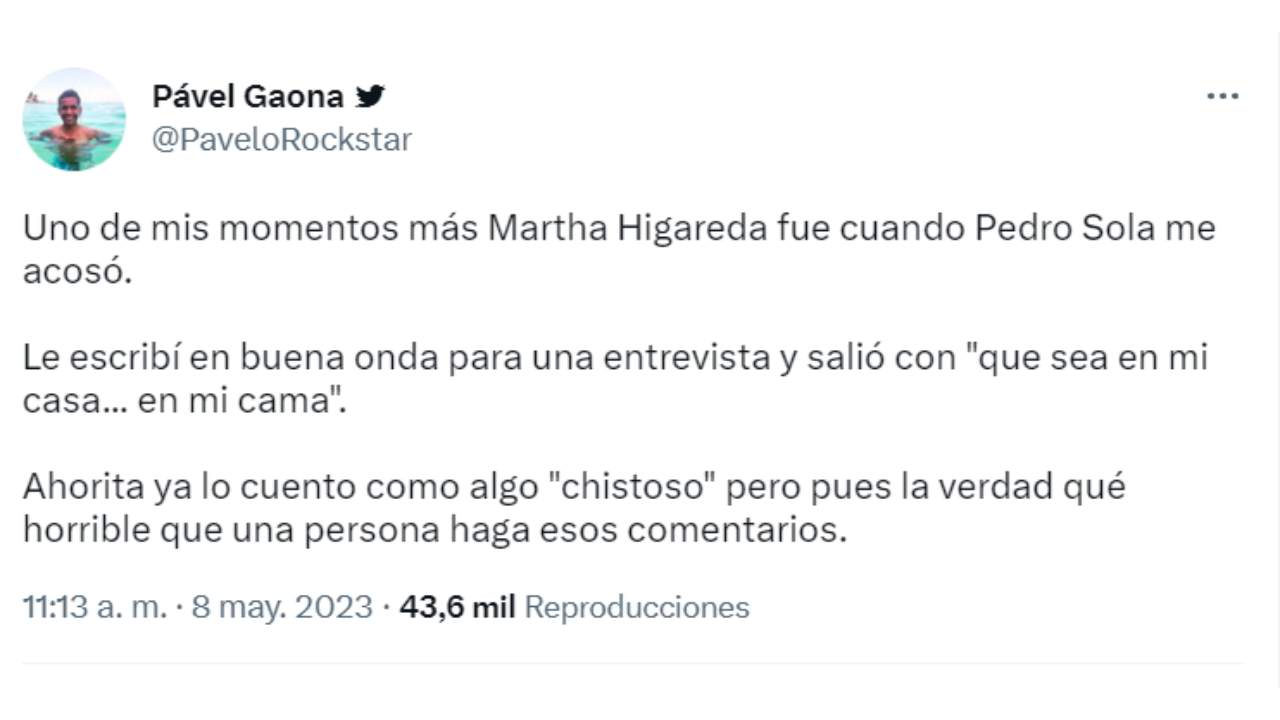 En la publicación se podía leer: "Uno de mis momentos más Martha Higareda fue cuando Pedro Sola me acosó. Le escribí en buena onda para una entrevista y salió con 'que sea en mi casa... en mi cama'. Ahorita ya lo cuento como algo "chistoso" pero pues la verdad qué horrible que una persona haga esos comentarios", compartió indignado el periodista, quien después de eso no quiso concretar la entrevista.