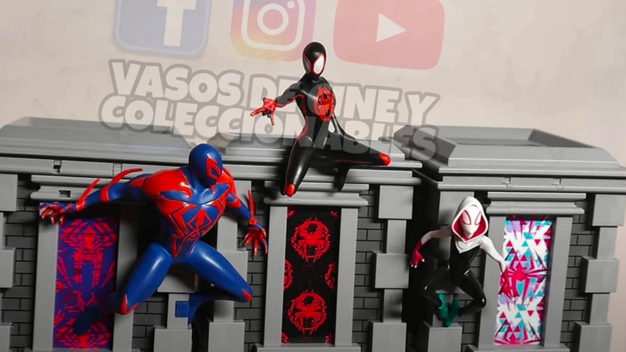 Esta mañana la cuenta Vasos de cine y coleccionables filtró la imagen de la palomera, la cual tiene la forma de un cubo. Cada uno de ellos cuenta con una figura de Spider-man 2099, Miles Morales o Spider-Ghost quienes parecen estar escalando una de las paredes, por dentro irán las palomitas. En la parte trasera podrás ver el logo de las arañas de cada uno de los personajes.