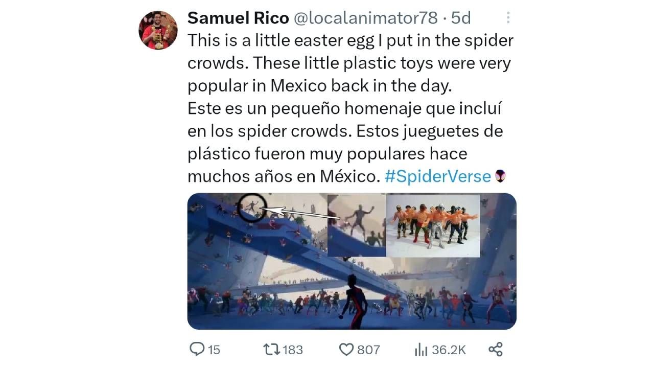 Seguramente tú también tuviste uno de esos muñecos para jugar cuando eras niño o niña, por lo que será muy grato ver a un objeto tan característico de nuestra cultura en una producción como esas. A pesar de que la pose del dibujo es la misma que tiene el juguete, tal vez habría sido difícil identificarlo entre tantas versiones del superhéroe si el animador no hubiera liberado la pista en su tweet.