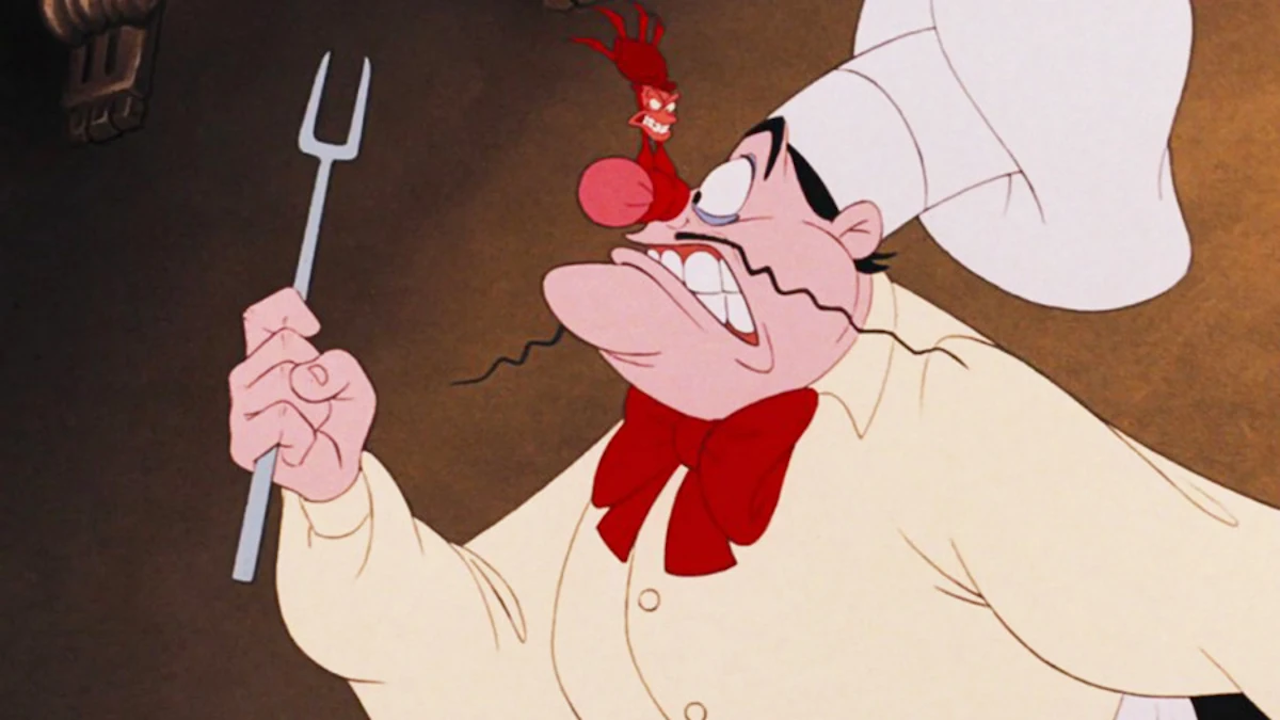 Indudablemente, el momento en que el alocado Chef Louis intenta atrapar a Sebastián para cocinarlo es una de las secuencias más divertidas de la versión animada. El cangrejo se encuentra rondando el castillo en búsqueda de Ariel cuando, sin planearlo, llega a la cocina y ve con sus propios ojos cómo el cocinero lleva de aquí para allá un par de pescados para ser preparados. Con horror, Sebastián intenta escabullirse sin ser visto, pero para su mala suerte, es visto por el chef.