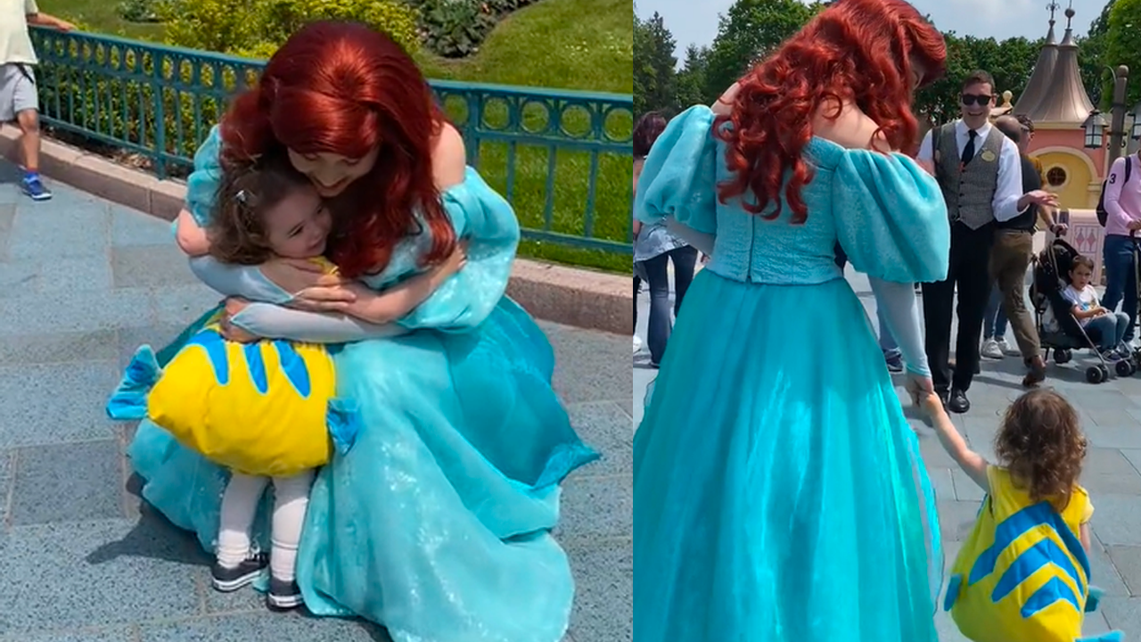 La niña optó por algo más vintage y usó una botarga del pez de la película animada original, por lo que rápidamente atrajo la mirada de cientos de personas, incluyendo la de la propia Ariel. Sí, así como leíste. La pequeña y su familia estaban de visita en Disneyland París, cuando de pronto se toparon con una actriz de La Sirenita, quien estaba usando un hermoso vestido color azul aqua. En cuanto la princesa la vio, corrió a darle un cariñoso abrazo.