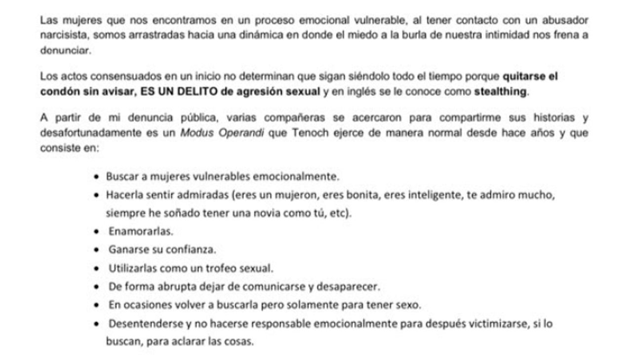 La activista aseguró que el protagonista de Hijo de Monarcas se aprovechó de que las leyes en México no protegen a las mujeres, ya que en la actualidad los colectivos siguen luchando por reformarlas y asegurar que los agresores reciban una condena adecuada. En respuesta al comunicado del actor, Rios declaró: "Los actos consensuados en un inicio no determinan que sigan siéndolo todo el tiempo porque quitarse el condón sin avisar, es un DELITO DE AGRESIÓN SEXUAL y en inglés se le conoce como stealthing", escribía.