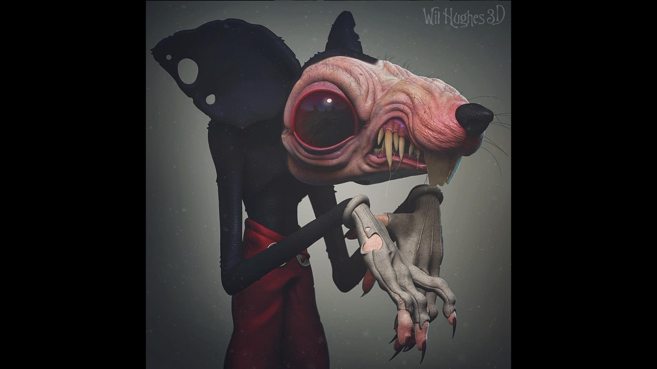 Este artista hizo del ratón más famoso de todos los tiempos lo impensable y lo convirtió en el roedor más terrorífico. Con una cabeza más grande que su cuerpo, ojos rojos estremecedores, dientes sucios y afilados, y unas garras al estilo Pesadilla en la calle del infierno, este Mickey Mouse no tendría piedad por nada ni por nadie.