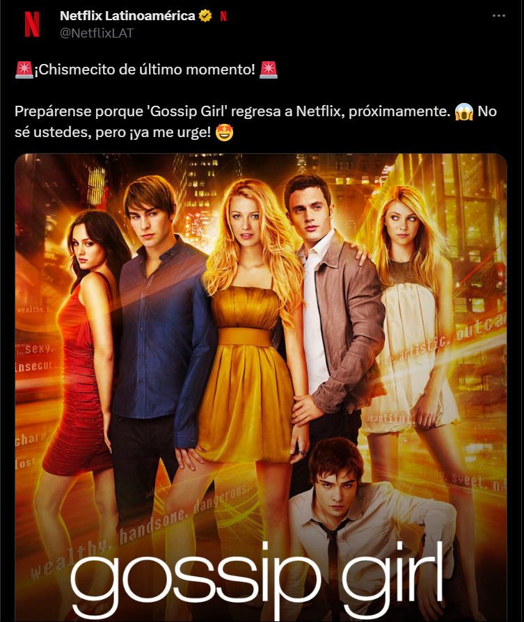 A través de su cuenta de Twitter la plataforma streaming en la que actualmente puedes disfrutar de The Witcher, A través del mar, Madre de alquiler y Misión rescate 2, compartió el siguiente mensaje: "¡Chismecito de último momento! Prepárense porque Gossip Girl regresa a Netflix, próximamente. No sé ustedes, pero ¡ya me urge!".