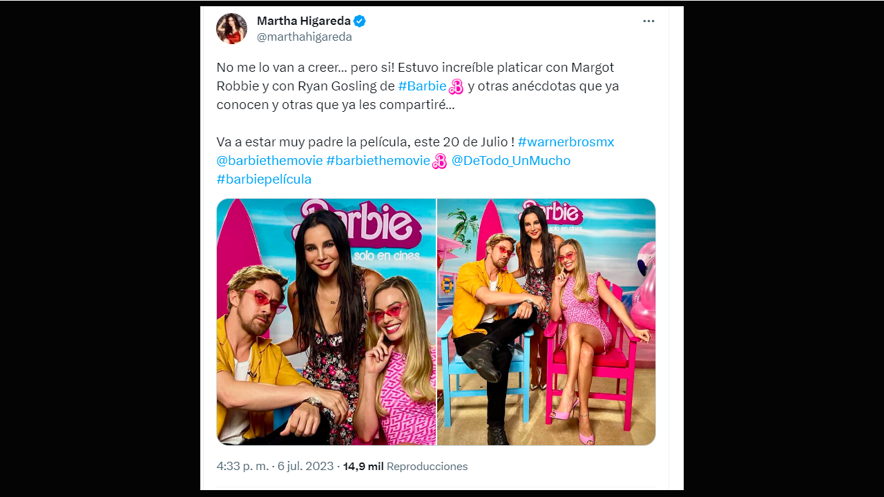 La publicación esta acompañada del texto: "No me lo van a creer… pero si! Estuvo increíble platicar con Margot Robbie y con Ryan Gosling de Barbie y otras anécdotas que ya conocen y otras que ya les compartiré", escribió, asegurando que tienen más historias juntos. Además invitó a la gente a ver la película el 20 de julio, fecha en que ocurrirá el Barbenheimer, ya sabes, por el estreno de Oppenheimer. En la foto podemos ver a los interprétes de Barbie y Ken con increíbles lentes rosas, en medio de ellos está Martha Higareda y por si fuera poco ya tenemos un adelanto del outfit que podrían usar en unas horas en la alfombra rosa.