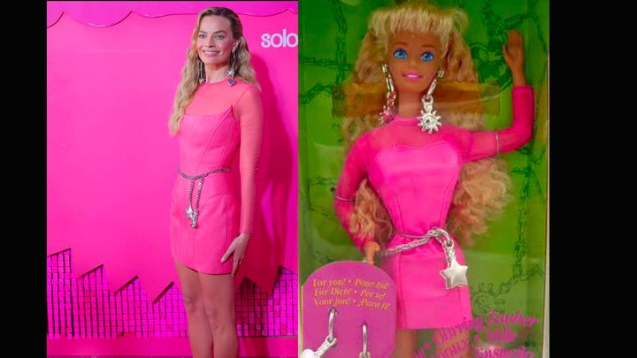 También, durante el segundo día de la promoción de la película, Robbie deslumbró a los asistentes con un segundo estilo noventero de Barbie de la línea de Totally Hair en el que viste un vestido al puro estilo de los setentas por su estampado a colores rosas, verdes y azules. Su peinado rizado muy natural con aretes maxi en tonos rosas. Esta versión que celebraba el 25 aniversario y haciendo homenaje a la muñeca de 1992, además incluía cinco accesorios para el cabello de Barbie, pero por esta tendrás que desembolsar una cantidad más grande de dinero a pesar de ser una muñeca lanzada en 2016, pues la podemos ver desde unos 2,200 pesos con empaque abierto, hasta cerca de 7,500 pesos mexicanos para una que estado completamente nuevo