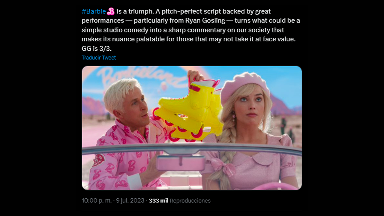 También se podían leer comentarios como "#Barbie es el mejor papel de Ryan Gosling hasta la fecha: Greta Gerwig toma todo lo que lo ha hecho grande en sus películas anteriores y lo combina en un Super-Gosling. El rumor de los Oscar es real, y si sucede, sería una de las nominaciones más divertidas e inspiradoras de los últimos tiempos".