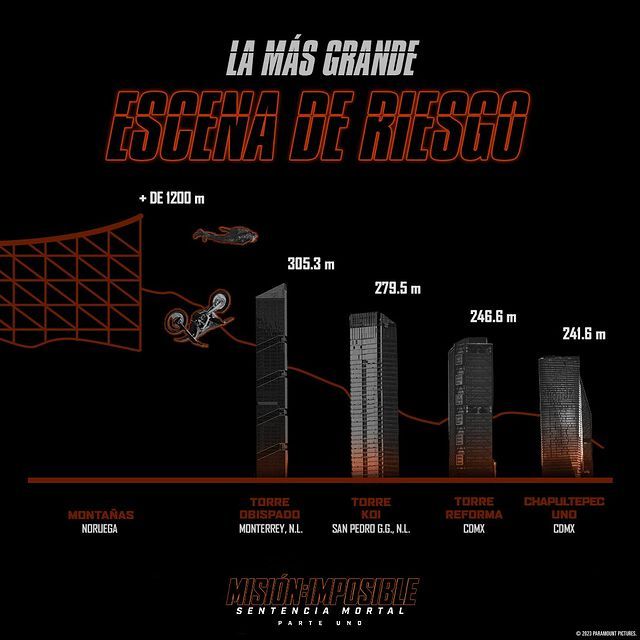 A través de redes sociales, Paramount Pictures compartió una imagen comparativa donde explica que Tom Cruise se lanzó de las montañas de Noruega a una altura de más de 1200 metros, algo que no se compara con los 305.3 metros de altura de la Torre Obispado de Monterrey, Nuevo León, el edificio más grande de México.