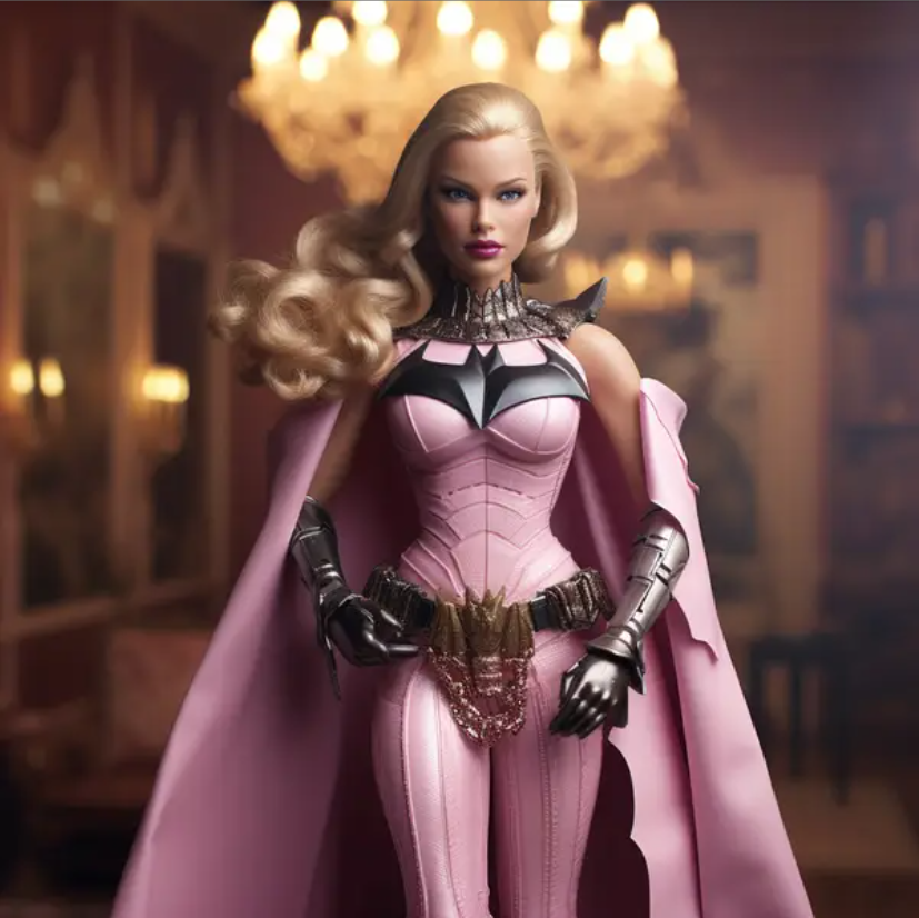 La imagen en turno fue creada por el avanzado programa Midjourney, donde se muestra a la icónica muñeca de Mattel vistiendo un impresionante exoesqueleto digno del Batman de Christian Bale. Y si te lo preguntabas: sí, todo es de color rosa con toques en negro como el clásico logo del murciélago, su baticinturón, guantes y algunas piezas más en tonos marrón oscuro.