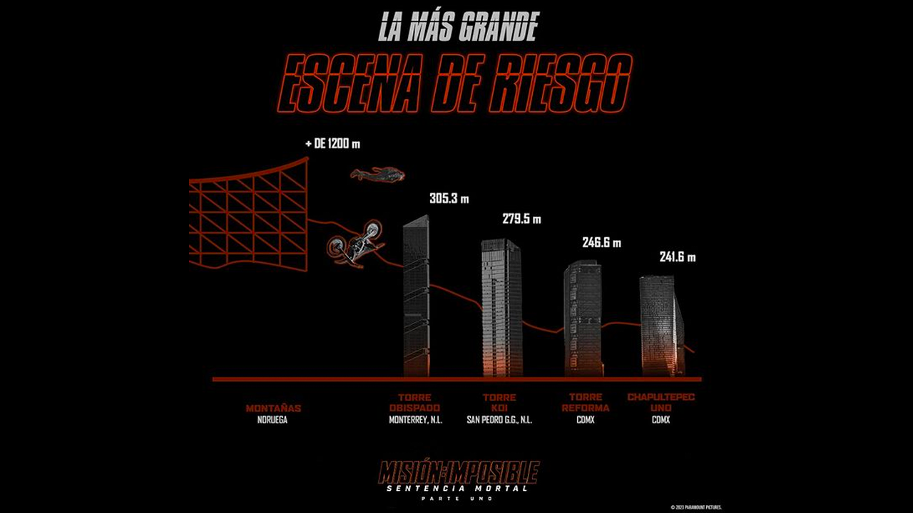 Para la nueva cinta de Misión Imposible, Tom realizó lo que bien podría ser la escena de acción más riesgosa de toda su carrera y es que el actor de Jack Reacher realizó un lanzamiento espectacular de más de 1200 metros de altura en las montañas de Noruega. Para darnos una idea a los mexicanos, Paramount Pictures compartió una imagen para explicar qué tan arriesgada fue la hazaña de Tom Cruise y la comparó con uno de los edificios más altos del país que se encuentra en la ciudad de Monterrey, Nuevo León.