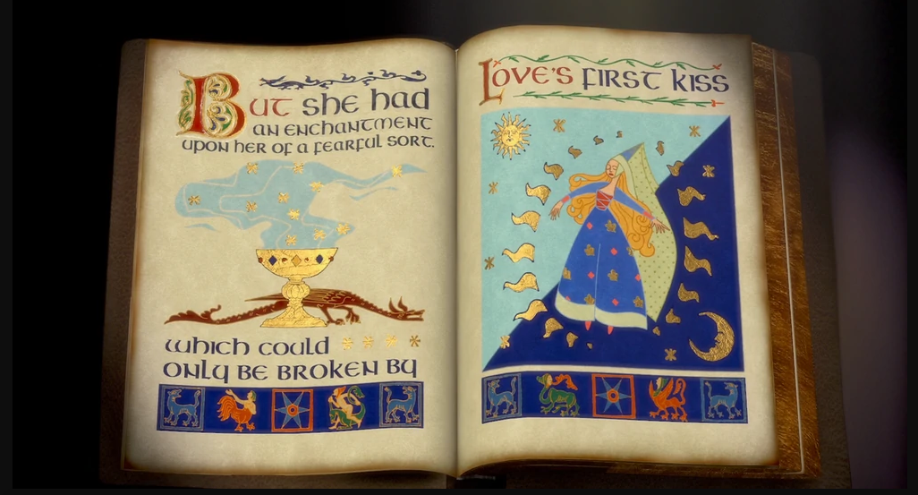 Y justo debajo algunas ilustraciones de menor tamaño que muestra distintas bestias muy parecidas a un dragón. Pero lo que termina siendo más que sospechoso es que a un costado aparece un cáliz dorado con un dragón rojo a sus pies. El resto del cuento recuerda cómo dicha princesa se encontraba atrapada en una torre alta en espera que el beso del verdadero amor rompiera el hechizo.