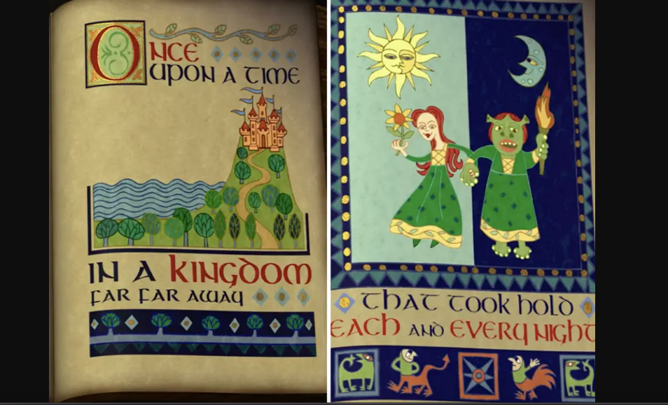 En dicha escena, antes de la icónica introducción de Shrek saliendo del baño con “All star” de los Smash Mouth sonando de fondo, podemos ver cómo se abre un libro antiguo que presenta a una “encantadora princesa” de cabello rubio, pero que estaba condenada por un terrible hechizo. En este segundo, una página muestra a dicha mujer en medio del dia y la noche y algunos destellos saliendo de su cuerpo, dando a entender que sufría de una radical transformación.