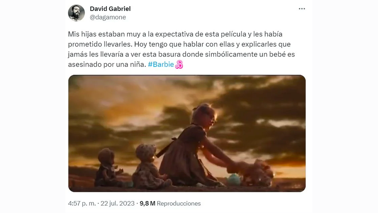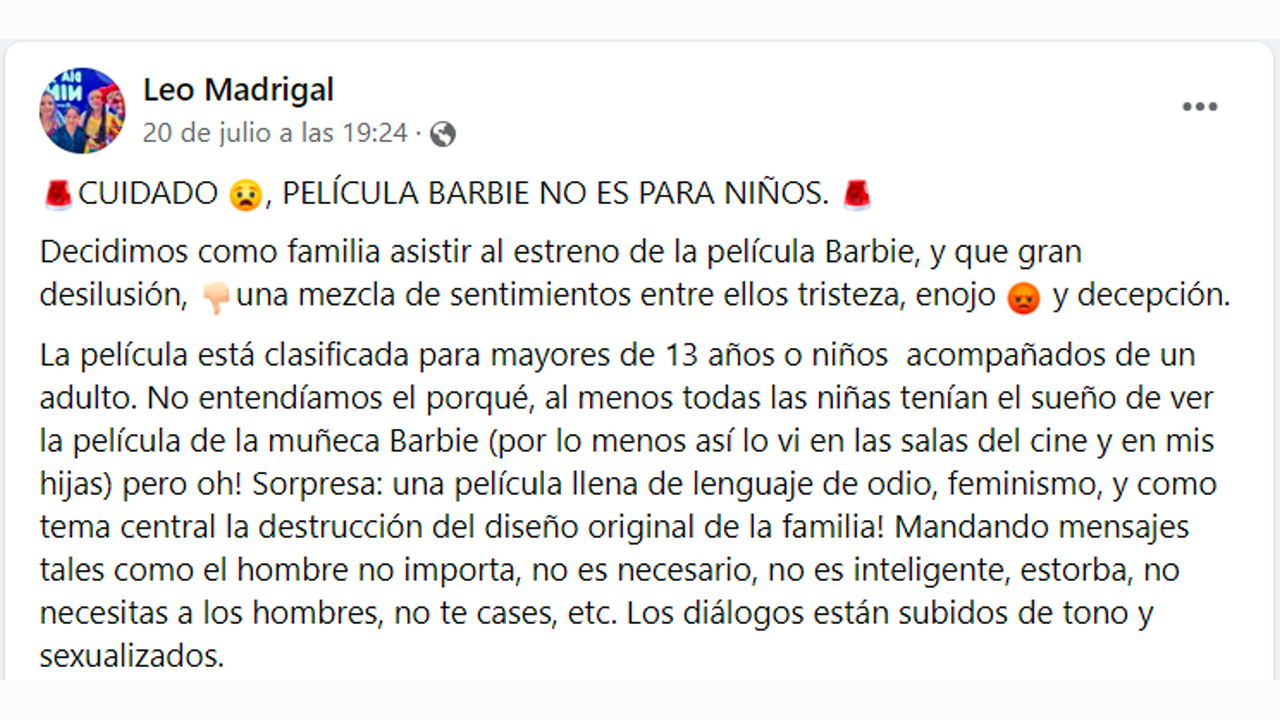 En estos días han surgido toda clase de mensajes en los que invitan a las personas a no ver Barbie protagonizada por Margot Robbie y Ryan Gosling, como esta publicación que se hizo viral en redes sociales. "La película está clasificada para mayores de 13 años o niños acompañados de un adulto. No entendíamos el porqué. Al menos todas las niñas tenían el sueño de ver la película de la muñeca Barbie, pero 'Oh! Sorpresa': una película llena de lenguaje de odio, feminismo ¡y como tema central la destrucción del diseño original de la familia!"