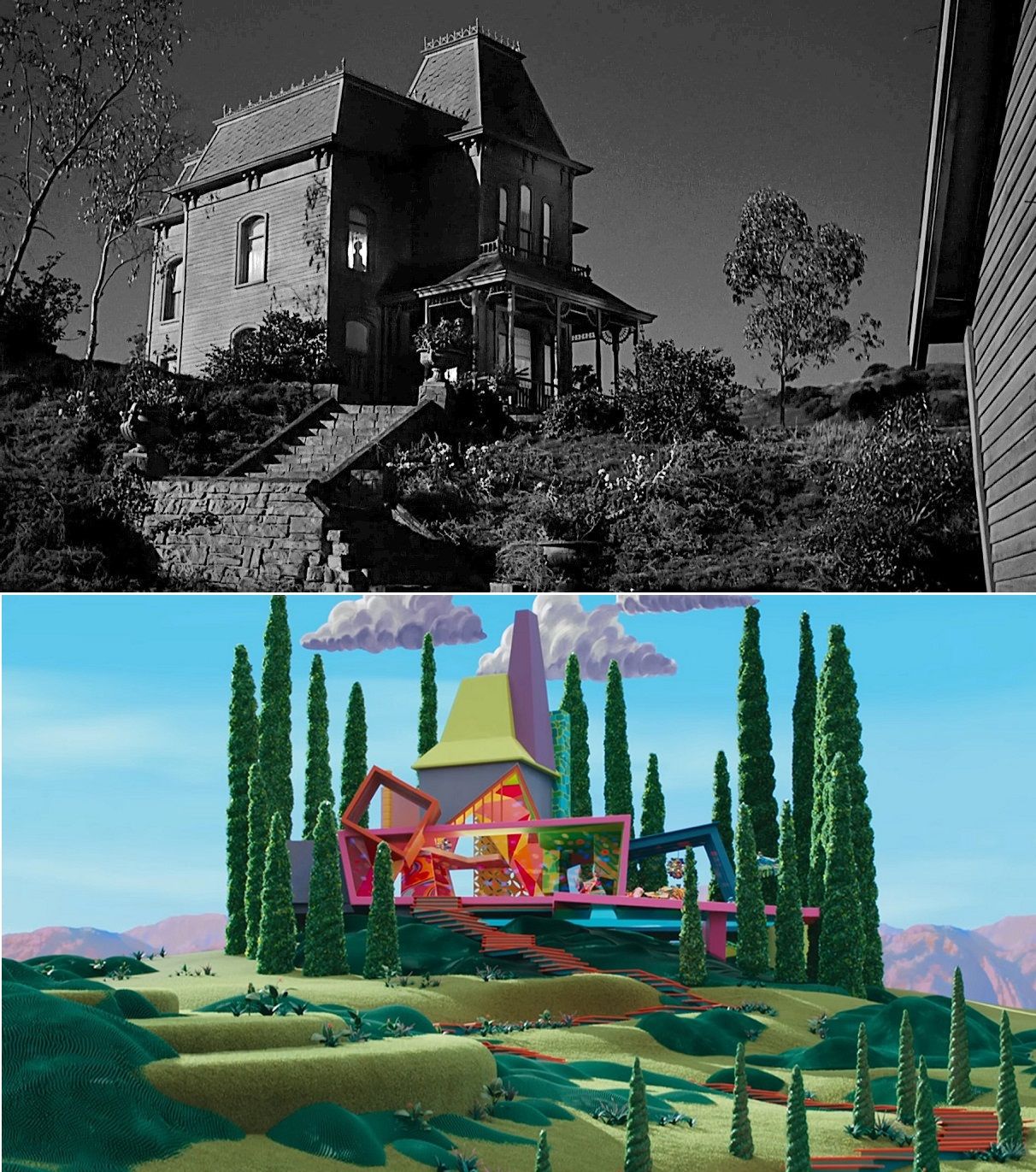 El filme de 1960 sigue causando sensación hasta la fecha y esto es aún más notable al saber que el hogar de la familia fue esencial para crear la morada de Weird Barbie. La estructura de la casa es muy similar, con los techos altos, rodeada de árboles y la escalinata que sube por la colina para llegar a la puerta de la residencia. Aunque la vivienda de la Barbie torturada tiene un toque de arquitectura modernista, no cabe duda que se nota la inspiración del clásico de Hitchcock en la nueva obra de Gerwig.