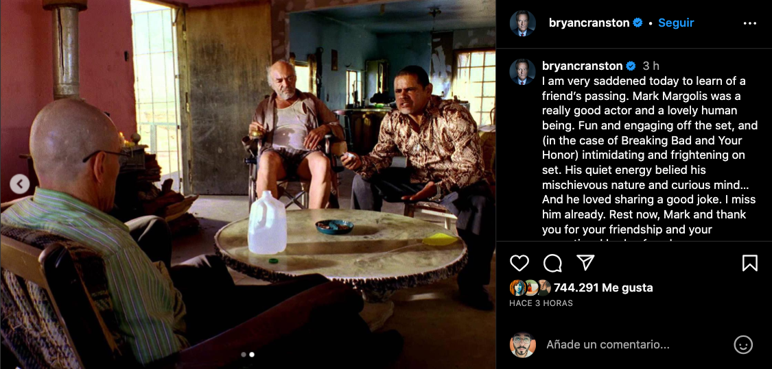 "Me entristece mucho enterarme hoy del fallecimiento de un amigo", escribió en redes sociales Bryan Cranston, "Mark Margolis era un buen actor y un ser humano encantador. Divertido y simpático fuera del set (y en el caso de Breaking Bad y Your Honor), intimidante y aterrador en el set. Su naturaleza tranquila ocultaba su carácter travieso y su mente curiosa... y le encantaba compartir un buen chiste. Ya le echo de menos. Descansa ahora, Mark, y gracias por tu amistad y tu excepcional obra”.