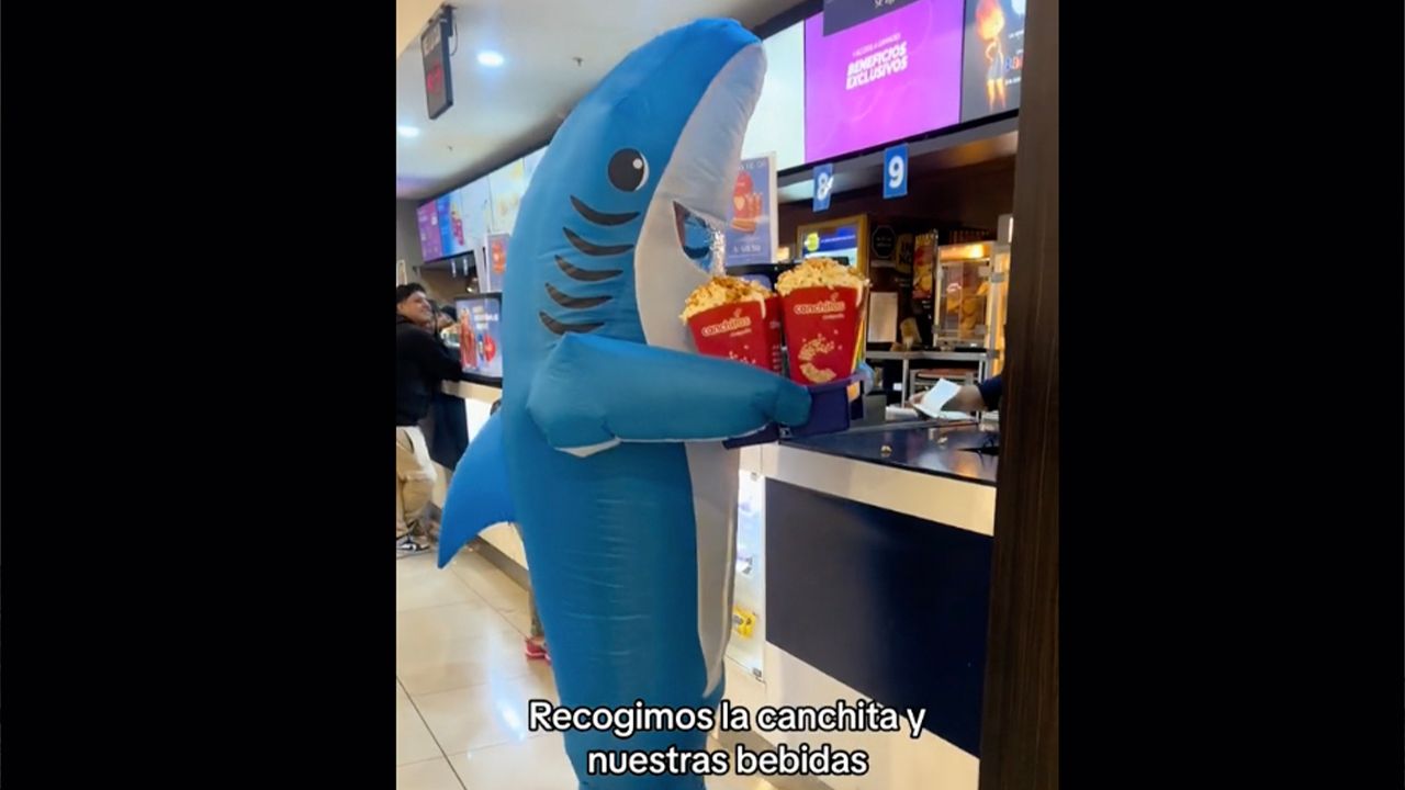 A través de TikTok el usuario Andres Reyes subió un video donde se le muestra dentro de este simpático disfraz de tiburón sonriente. En un principio parecía que la gente que asistió a un complejo de Cinépolis sólo lo veía de lejitos, incluso compró palomitas y entró emocionado a la sala.