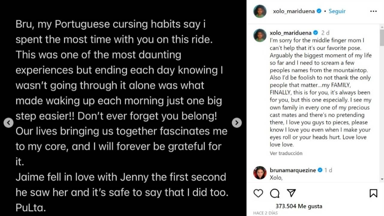 Durante el fin de semana de estreno, Maridueña compartió una galería de fotos en Instagram donde expresaba palabras de apoyo a sus compañeros de trabajo en la producción, pero en su mensaje a Marquezine, escribió: “El hecho de que nuestro destino nos haya traído juntos me fascina de una manera impensable y estaré agradecido por ello de por vida. Jaime se enamoró de Jenny en el primer segundo en que la vio y es obvio que yo lo hice también”.
