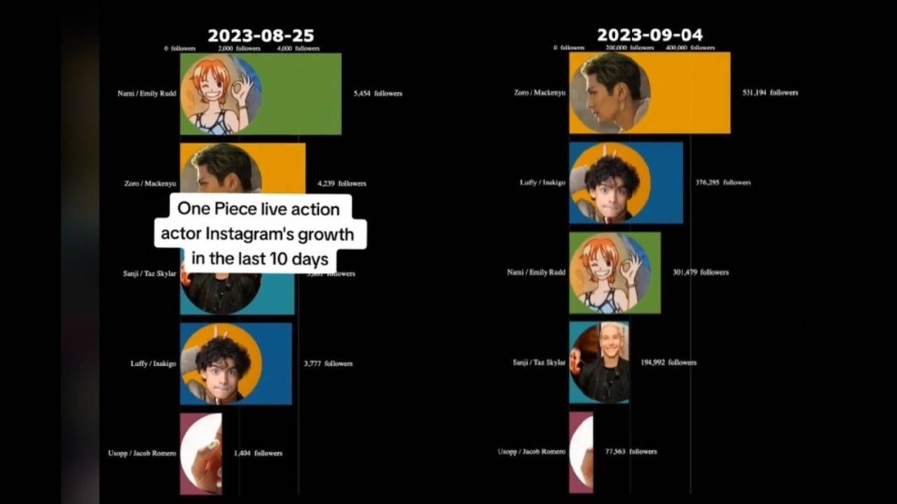 En Tik Tok se viralizó un video de la cuenta @masteronepiece en el que se muestra una gráfica en la que compara la cantidad de seguidores que recibieron los protagonistas de One Piece en un lapso de tiempo de tan solo 10 días. El conteo se comenzó a realizar el 25 de agosto, a una semana de que se estrenara el live-action en Netflix y para el 4 de septiembre, Arata Mackenyu ya había ganado más de medio millón de followers.