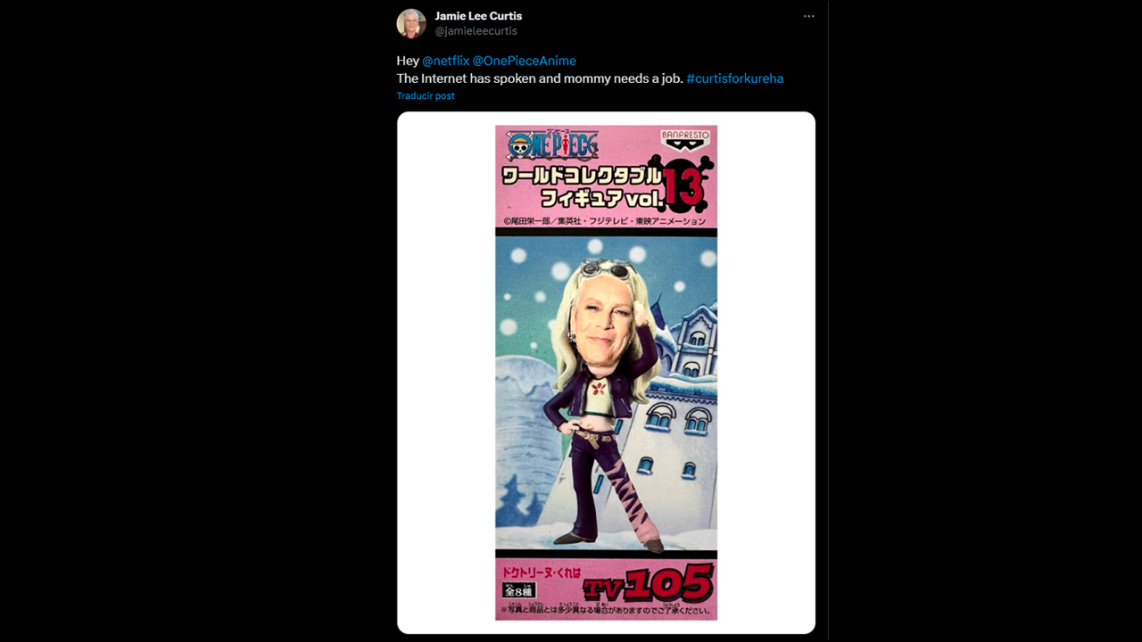 Incluso la estrella de Halloween compartió un twit revelando su interés por ser parte de la serie. "Oye Netflix. Internet ha hablado y mami necesita un trabajo", junto a la publicación aparece un edit de ella como la Doctora Kureha, una declaración que emocionó al fandom. ¿Te gustaría ver a Jamie Lee Curtis en One Piece? Por ahora solo falta que Netflix dé la luz verde.
