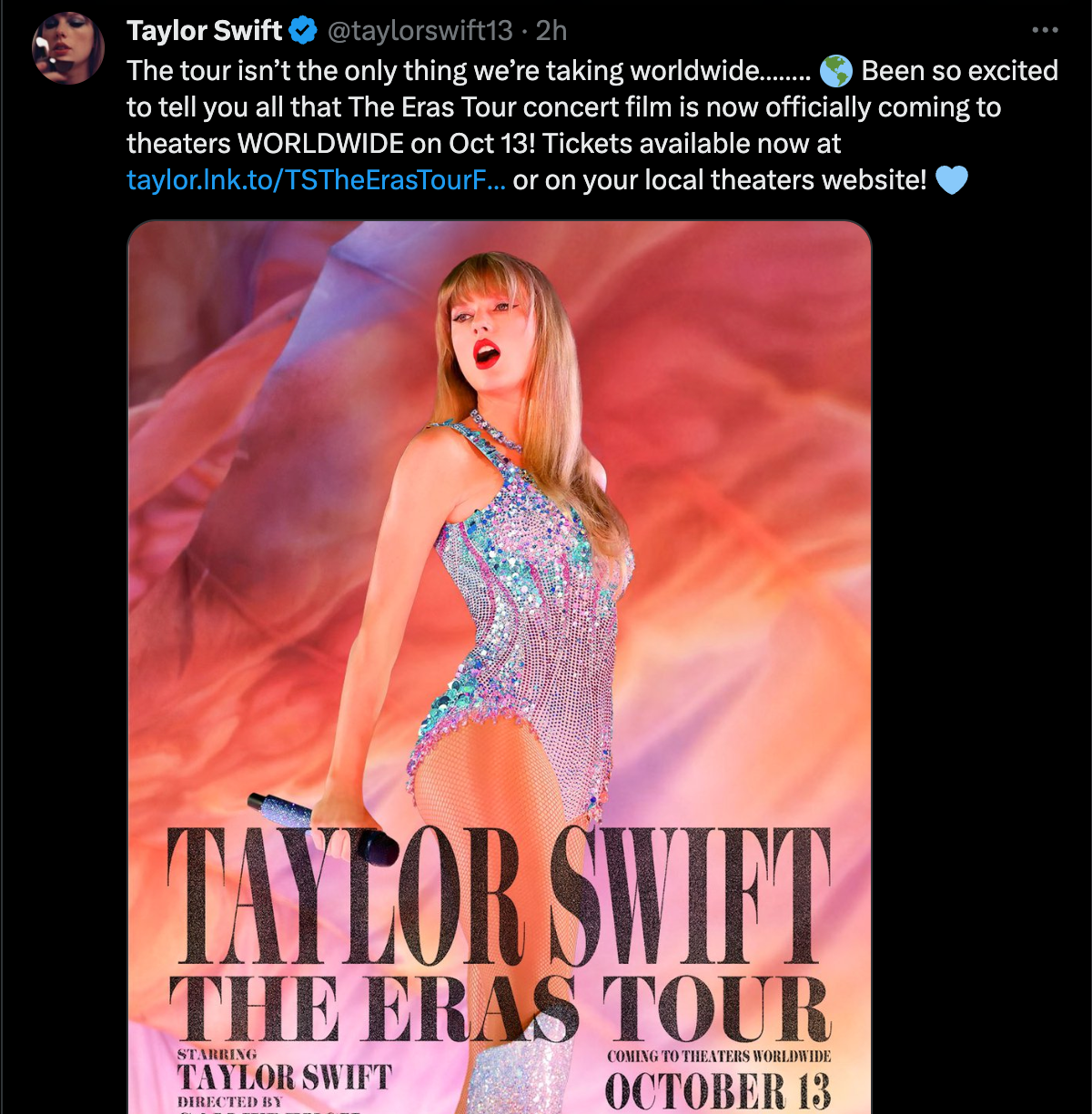 Y aunque nos encantaría confirmar que agregó más fechas de su gira, no se trata de esa clase de noticias. A través de redes sociales la también actriz de Amsterdam y Cats hizo oficial que la película The Eras Tour llegará a más de 100 países a partir del 13 de octubre.