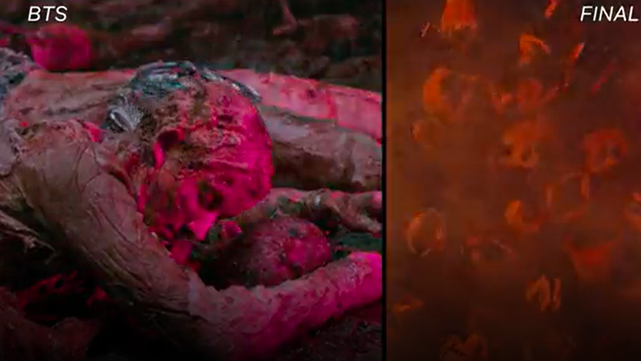 A través de una publicación en X (antes Twitter) vemos como los actores tienen prostéticos en todo el cuerpo, asimismo arrojan pintura para que parezca que se trata de la sangre y la piel desecha. Todos los actores están cubiertos con pintura roja que ayuda a generar este efecto de quemadura. Asimismo hay esqueletos de utilería que permiten construir este escenario devastador. ¿Cuál fue tu muerte favorita?