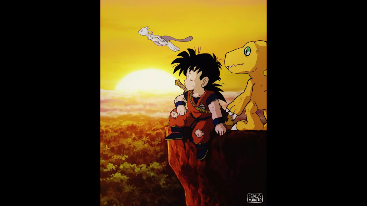 La imagen muestra a un pequeño Gohan contemplando al horizonte en lo que parece ser un atardecer lleno de tranquilidad. A su lado está Agumon, quien le hace compañía muy de cerca y también se toma un momento para admirar el paisaje que tiene frente a él. Además de ver el panorama, ambos personajes están mirando a Mewtwo, quien está volando hacia un destino desconocido, quizá en camino para una misión con otros monstruos de bolsillo.