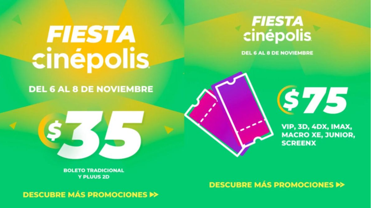 Del 6 al 8 de noviembre, Cinépolis estará celebrando con toda la energía al séptimo arte con grandes descuentos en todos sus complejos en la República Mexicana. Durante La Fiesta Cinépolis, los boletos para funciones en salas tradicionales y PLUUS tendrán un valor de 35 pesos; y por solo 75 pesos podrás comprar tus boletos para proyecciones en formatos VIP, 3D, 4DX, IMAX, MACRO XE, JUNIOR y SCREENX. Lo mejor de todo es que estos precios son válidos para compras en la página web de Cinépolis, aplicación para dispositivos móviles y también en taquillas.