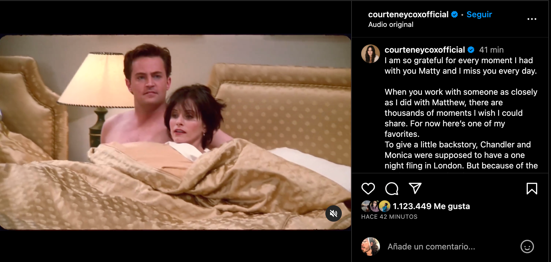 “Cuando trabajas con alguien tan de cerca como lo hice con Matthew, hay miles de momentos que desearía poder compartir. Por ahora aquí está uno de mis favoritos. Para hacer un poco de historia, se suponía que Chandler y Monica iban a tener una aventura de una noche en Londres. Pero debido a la reacción del público, se convirtió en el comienzo de su historia de amor”, recordó Cox.