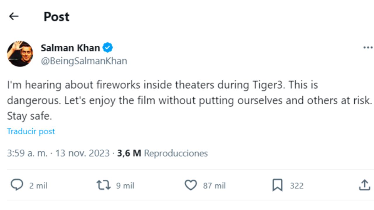 "He oído hablar de fuegos artificiales dentro de los cines durante Tiger 3. Esto es peligroso. Disfrutemos de la película sin ponernos en riesgo a nosotros mismos y a los demás. Mantengámonos a salvo".