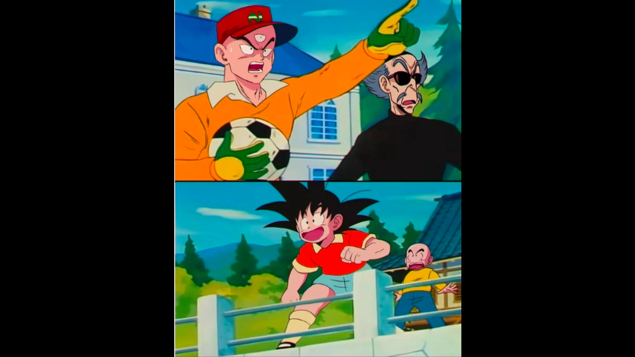 En la segunda imagen, es posible ver a otros personajes de Dragon Ball en el mundo de Supercampeones. Aquí está Goku en una versión más joven junto a Krillin, probablemente en uno de los entrenamientos realizados por el maestro Roshi. También se encuentra Ten Shi Han como el arquero, quien conserva su tercer ojo por haber llegado a un estado especial de fortaleza mental y física para el deporte.