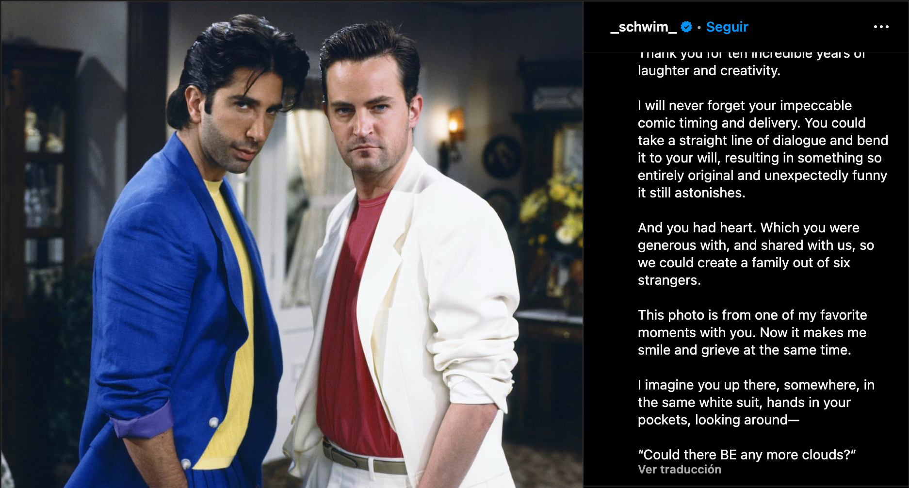 Al mismo tiempo David Schwimmer compartió un extenso mensaje donde recordó los años de amistad y trabajo con Matthey Perry. “Gracias por diez años increíbles de risas y creatividad. Nunca olvidaré tu impecable ritmo cómico. Podías tomar una línea recta de diálogo y adaptarla a tu voluntad, dando como resultado algo tan original e inesperadamente divertido que todavía me asombra”.