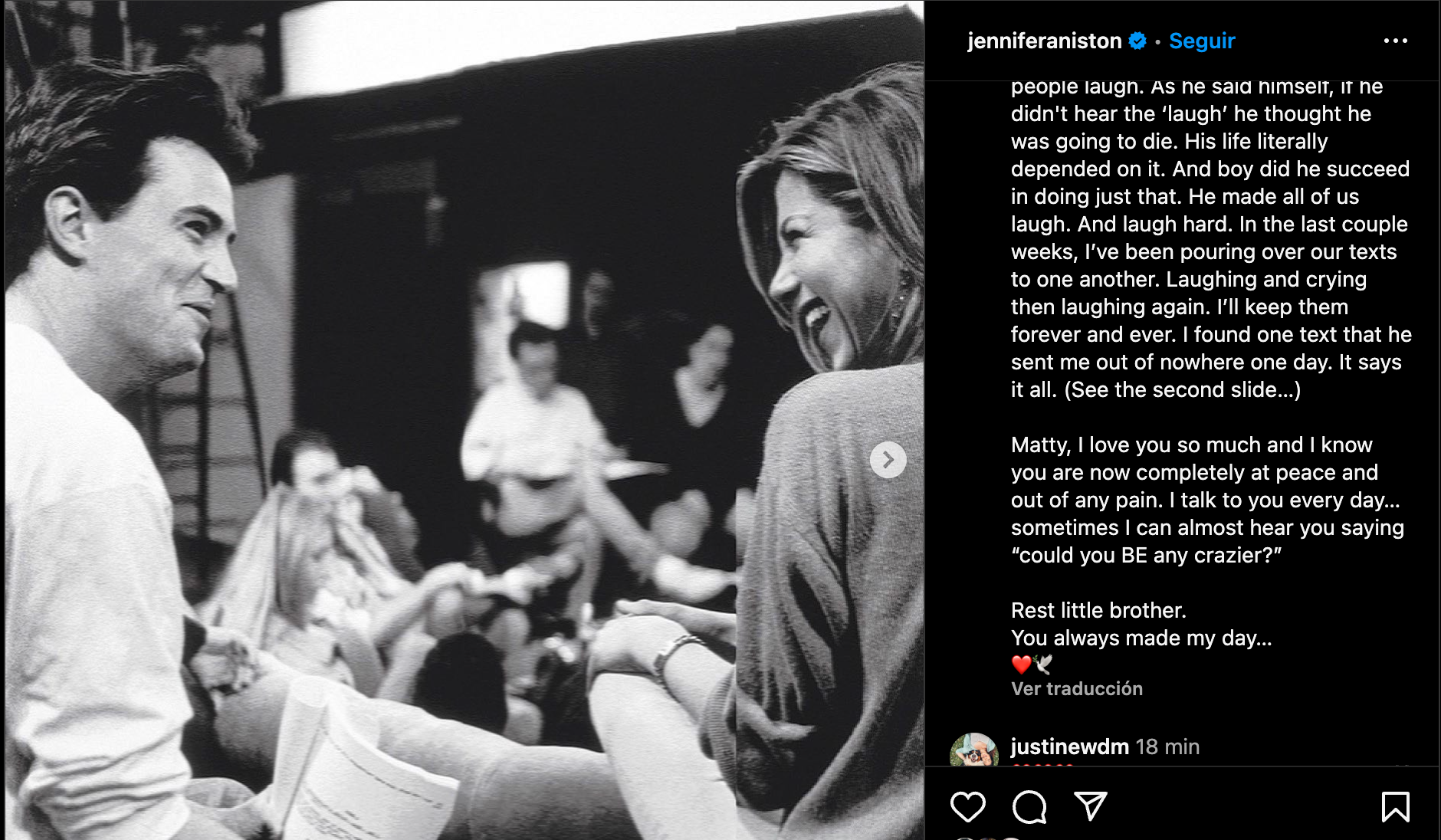 Los primeros fueron Matt LeBlanc y Courteney Cox, y esta mañana fue turno de Jennifer Aniston y David Schwimmer, quienes a través de Instagram compartieron los siguientes mensajes para honrar la memoria de Perry. “Estoy tocando fondo... Tener que decir adiós a nuestro Matty ha sido una oleada de emociones que nunca antes había experimentado. Todos experimentamos pérdidas en algún momento de nuestras vidas. Pérdida de la vida o pérdida del amor. Ser capaz de SENTARSE realmente en este dolor te permite sentir los momentos de alegría y gratitud por haber amado a alguien tan profundamente”, mencionó Aniston.